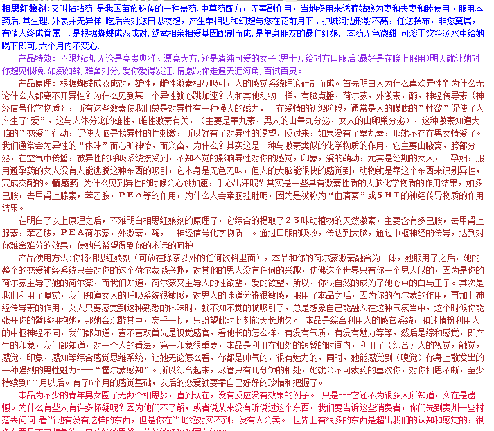 云南情蛊药相思红娘剂中草药配方,无毒副作用,当地多用来追求未婚男女为对象和夫妻和睦使用。对方服用本药后,其生理,外表并无异样.不管男女吃后会对您日思夜想,产生单相思和幻想与您在花前月下、护城河边形影不离,任您摆布,非您莫属,有情人终成眷属。云南情蛊药相思红娘剂是根据蝴蝶成双成对,鸳鸯相亲相爱基因配制而成,是单身朋友的最佳红娘,是挽救夫妻感情不和最好办法。不限场地,无论是高贵典雅、漂亮大方,还是清纯可爱的女子(男士),给对方口服云南情蛊药相思红娘剂后(最好是在晚上服用)明天就让对方想见恨晚,如痴如醉,难舍对分,爱你爱得发狂,情愿跟你走遍天涯海角,百试百灵。相思红娘剂的神奇效果令人目瞪口呆。亲爱的朋友,也许你相貌平凡家庭贫困,使你有了喜欢的女人却得不到而痛苦万分。也许你是一个并不出彩的女孩子喜欢上了一个男孩子,可是他却对你一屑不顾让你害上单相思。也许你的家庭正出现危机,你的爱人有了第三者而使你痛不欲生。那么请你赶紧购买情蛊药相思红娘剂使用,你的一切都会改变,一切都会随你所愿,有情人终成眷属。相思红娘剂为不少的青年男女圆了相思梦,为不少反目夫妻挽救感情破镜重圆,直到现在,没有反应没有效果的例子。上海生命基因研究所刘震华教授闻听此药的神奇效果后,深入苗族地区做实地调查研究,亲眼见证了云南情蛊药相思红娘剂的神奇作用,但是他也承认到现在为止也研究不出来,相思红娘剂为何有如此神奇效果,为此,刘教授特地在《生命研究杂志》2012年第3期撰文介绍此药,引起轰动。刘教授表示情蛊药相思红娘剂确实神奇,只是它还不为很多人所知道,实在是遗憾。为什么有些人有许多怀疑呢?因为他们不了解,其实很多中国古老神秘的东西是远远超出人类的认识,很多人滞留在了已有的知识领域,认知范围内,裹足不前,对新生事物总是拒之门外,充耳不闻。很多弄不清楚原因的东西被斥责为伪科学,信,邪术,实在是一个误区。很多人都在苦苦的追求自己心目中理想的梦中情人却不如愿,相信在云南情蛊相思红娘剂的帮助下你一定会得到最爱的他她