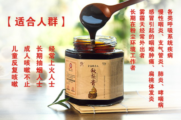 针对人群症状:儿童反复咳嗽、成人咳嗽不止、长期吸烟人士、经常上火人士、长期在粉尘环境工作者、雾霾天经常外出者、感冒引起的咽喉肿痛、扁桃体炎症、慢性咽炎、支气管炎、肺炎、哮喘病、各类呼吸系统疾病。具有止咳化痰、清喉降火、清心润肺、除烦解渴、生津利咽、润燥消风等功效。