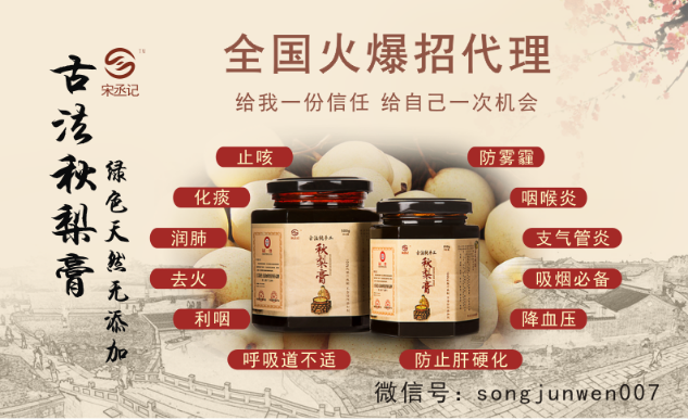 现在开启全国火爆招商模式,宋丞记古法秋梨膏招收各地区微商代理,请加V 信:songjunwen007,赶快加入给我们吧,给我们一份信任,给自己一个机会,让我们共创未来,未来将是天然0添加产品的年代,远离抗生素泛滥的时代,采用古法非物质文化遗产工艺,赢得广大客户的良好口碑,迅速占领市场。