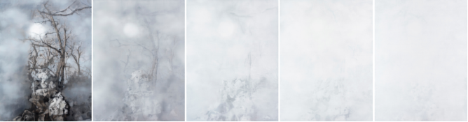 看惯了传统水墨的山水人物,也厌倦了机械的定格照片,如果不是看到他的画,你无法想像还有这样的艺术表达形式。这似曾相识的一瞬,可以让思想刹那穿越到某时某地的亲身感触,似是而非的画面,不管谁都能在内心找到一丝认同。这就是叶剑青的风格,气场强大到可以将观者笼罩于云雾,在水中看世界如扭曲的梦境照进现实,以及千变万化的观音像,都能让你感受到他与众不同的精神世界。你不会排斥,更不会谓之怪异,因为这是每个人都有所经历,却忽略遗失的那部分美好,而在这里却独成体系,用画面表达的淋漓尽致。