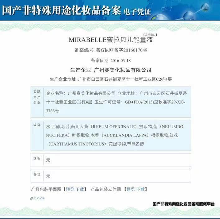 蜜拉贝儿溶脂针能量液产品成分:水,乙醇,冰片,药用大黄(RHEUM OFFICINALE)提取物,莲(NELUMBO NUCIFERA)叶提取物,木香(AUCKLANDIA LAPPA)根提取物,红花(CARTHAMUS TINCTORIUS)花提取物,苯氧乙醇。 蜜拉贝儿能量液溶脂针 产品净含量:20ml
