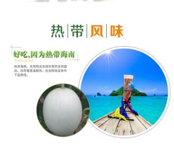 海南春暖花开生态农业公司出产的“鲁加蜜”品牌白雪蜜甜瓜,引进台湾优良品种“翠甜”甜瓜种子进行种植,种植果园在海南省乐东县佛罗镇龙沐湾海沙土地上。
