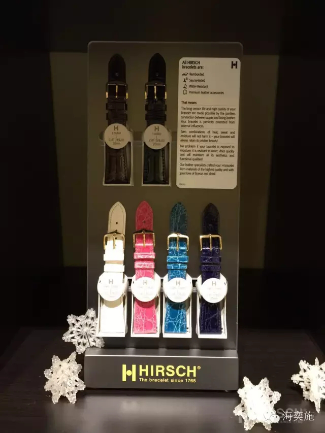 Hirsch和皮革之间的联系可以追溯到18世纪:Johannes Franz Hirsch,出生于1765年,并在南奥地利的Neunkirchen开设皮革工厂。自那时开始,Hirsch家族一直从事皮革加工。 Hirsch的历史,其独特之处在于许多重要的创新,从无缝半包生产技术把面皮和衬里皮组合﹑研发防水皮革以及发明防过敏皮革之技术。所有我们的创新,其目的是为了确保在任何情况下佩带手镯都能令手镯更长寿命,更舒适和更美观。 Hirsch作为技术合作伙伴及对手镯的感觉和知识,使公司能够提供全面的支持予手表制造业的开发工作及专门的手表零售贸易。这使得海奕施作为最专业的合作伙伴,对制表行业的开发活动及专业手表零售商提供强大的支持。海奕施充分展现了其专业并将手镯文化代代相传.